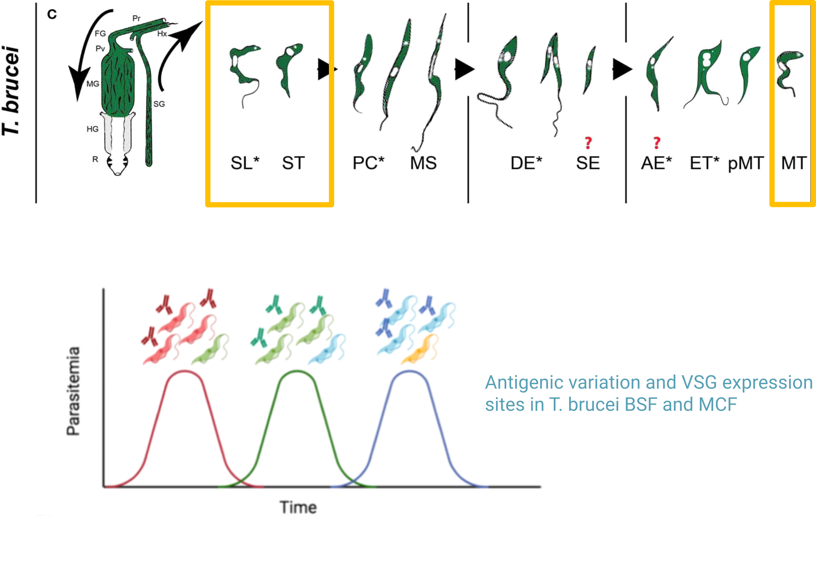 Rotureau B, Front. Cell Infect. Microbiol. 2013 — Pr: proboscis, FG: foregut, Pv: proventriculus, PM: peritrophic matrix, MG: midgut, HG: hindgut, R: rectum, Hx: hypopharynx, SG: salivary glands